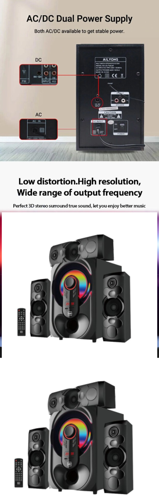 - Flexible Power Source: Our SUPERBASS home cinema system is compatible with both DC and AC power sources, offering the convenience of using standard household power outlets or battery backup for easy portability and operation.