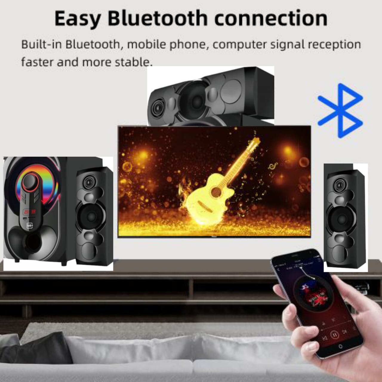 Complement your home decor with a stylish and modern design that fits seamlessly into any room. Our Bluetooth home theater system not only sounds amazing but also looks stunning, adding a touch of elegance to your space.